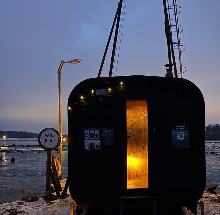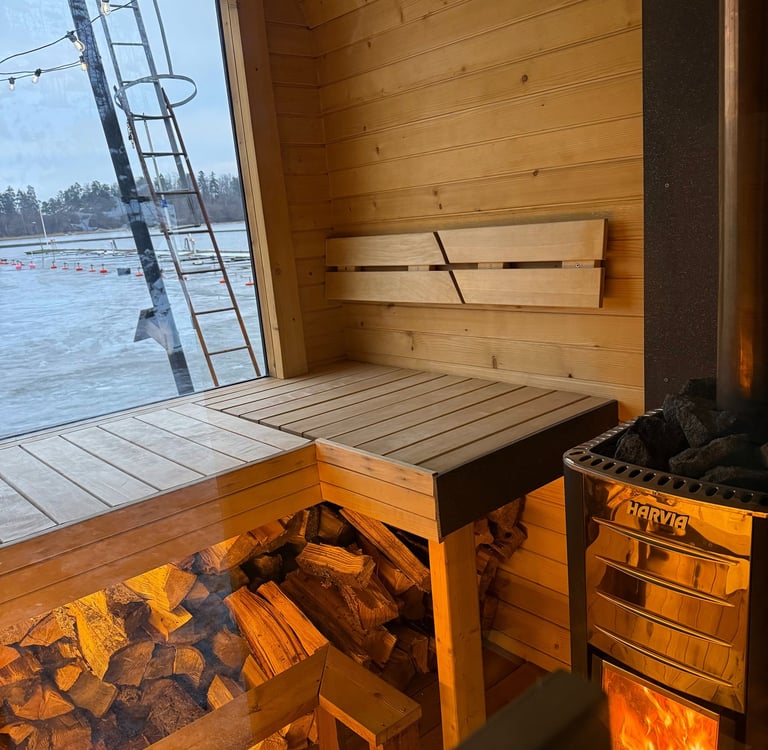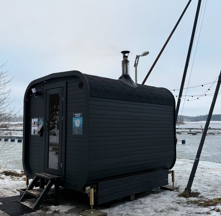 Ofta är bastun redan varm från ett tidigare sällskap, så boka gärna en tid direkt efter någon annan. Annars kan du komma tidigare och värma upp den själv. Ved och tändare finns på plats. Det tar cirka 30 minuter.