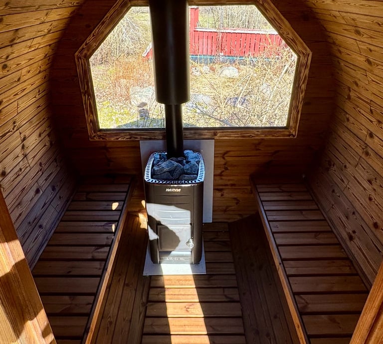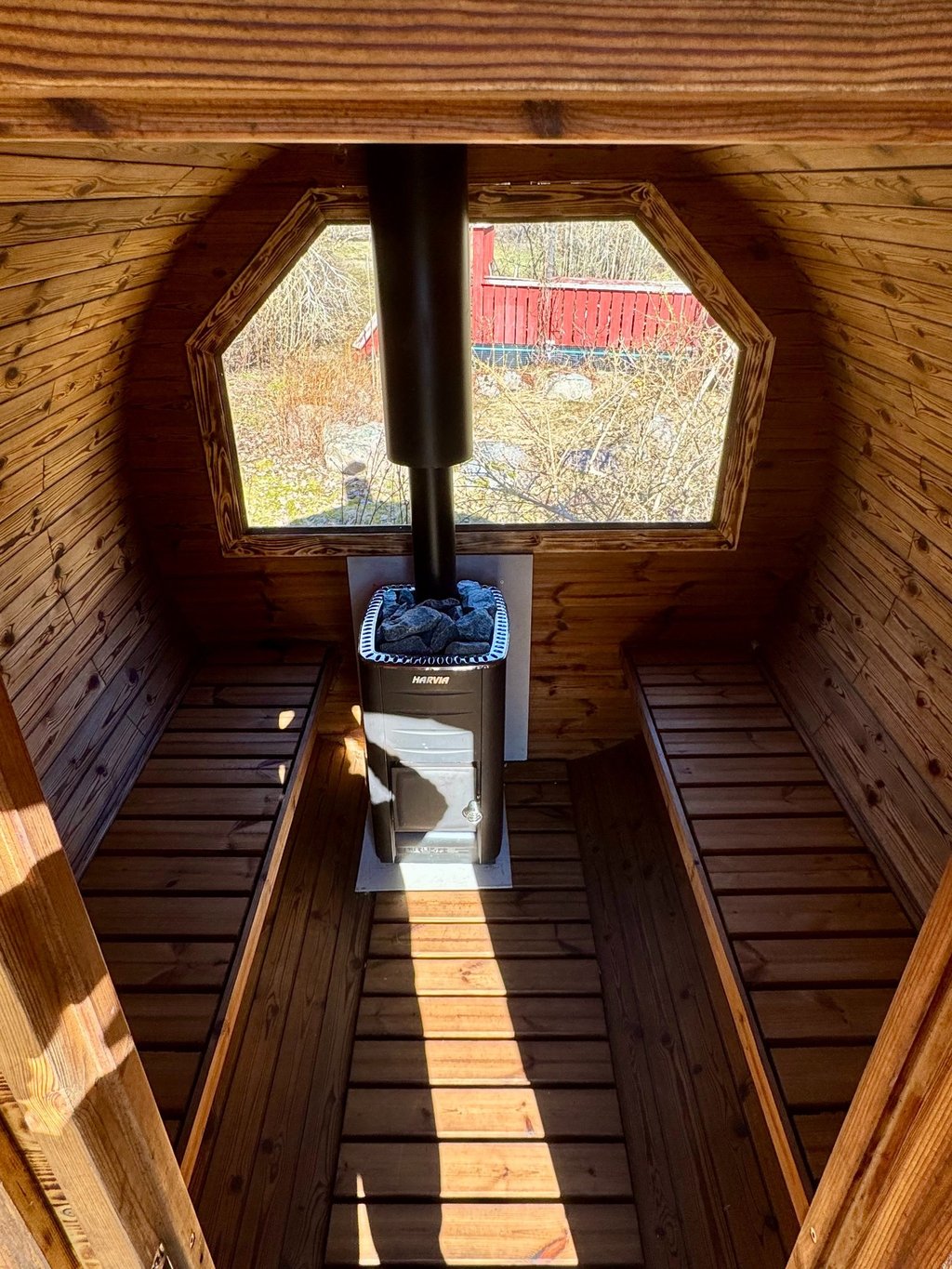 All utrustning: 80L björkved, bastuoljor, stämningsfull belysning, högtalare, hink & slev.